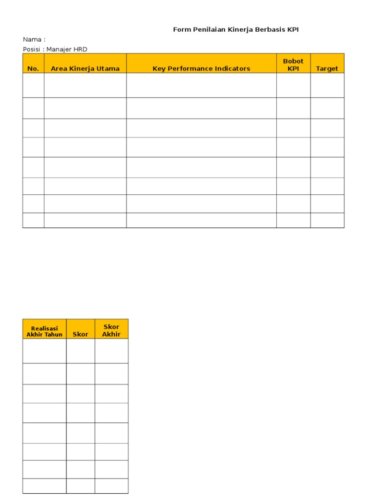 Dalam file terlampir, dapat dilihat contoh form tabel performance appraisal berbasis kpi.