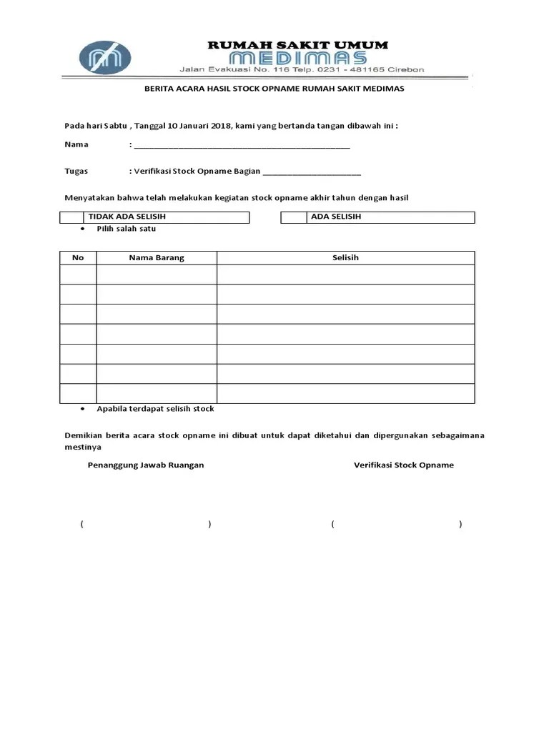 3.4 berita acara hasil pelaksanaan stock opname. Jika ternyata ditemukan selisih antara persediaan barang dan data yang terdapat dalam pembukuan, maka selanjutnya dilakukan pemeriksaan lebih lanjut terhadap . Terdapat selisih antara fisik barang dengan buku persediaan. Petugas stock opname/ gudang membuat berita acara apabila terjadi kehilangan barang dan laporkan. Stock opname adalah kegiatan perhitungan persediaan stok barang yang ada di gudang . Berita acara serah terima barang adalah dokumen yang berisi pernyataan serah terima barang antara pihak yang menyerahkan dengan pejabat. Berita acara serah terima barang adalah dokumen yang berisi pernyataan serah terima barang. (3) berita acara stock opname sebagaimana dimaksud pada ayat (2) dibuat sesuai contoh sebagaimana tercantum dalam lampiran iii peraturan ini. Berikut contoh berita acara stock opname yang benar. Stock gudang untuk menelusuri selisih tersebut. Dokumen ini jika diperlukan, digunakan untuk menjelaskan terjadinya selisih barang, . Nazarius lamar (logistic manager) pada hari ini., tanggal., bulan.tahun. Apakah rekan2 disini pernah terima surat .